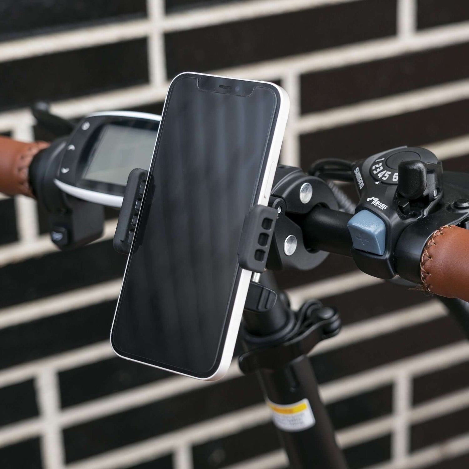 Pode ser usado em bicicletas, scooters e motocicletas. Inclui um elástico antiderrapante para fixar com seguranca o seu dispositivo, pode ser girado 360º para ajustar o ângulo de visão.