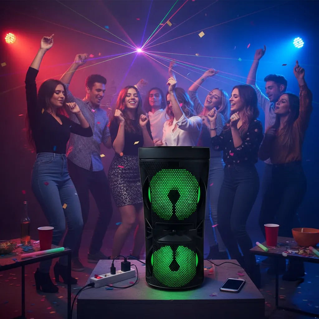 O KTS-2160 é um alto-falante portátil ideal para karaokê, festas ou uso doméstico. Seu design moderno com luzes LED RGB, alto-falantes duplos de 6,5", bateria recarregável e microfone sem fio o tornam um dispositivo versátil e divertido.
