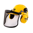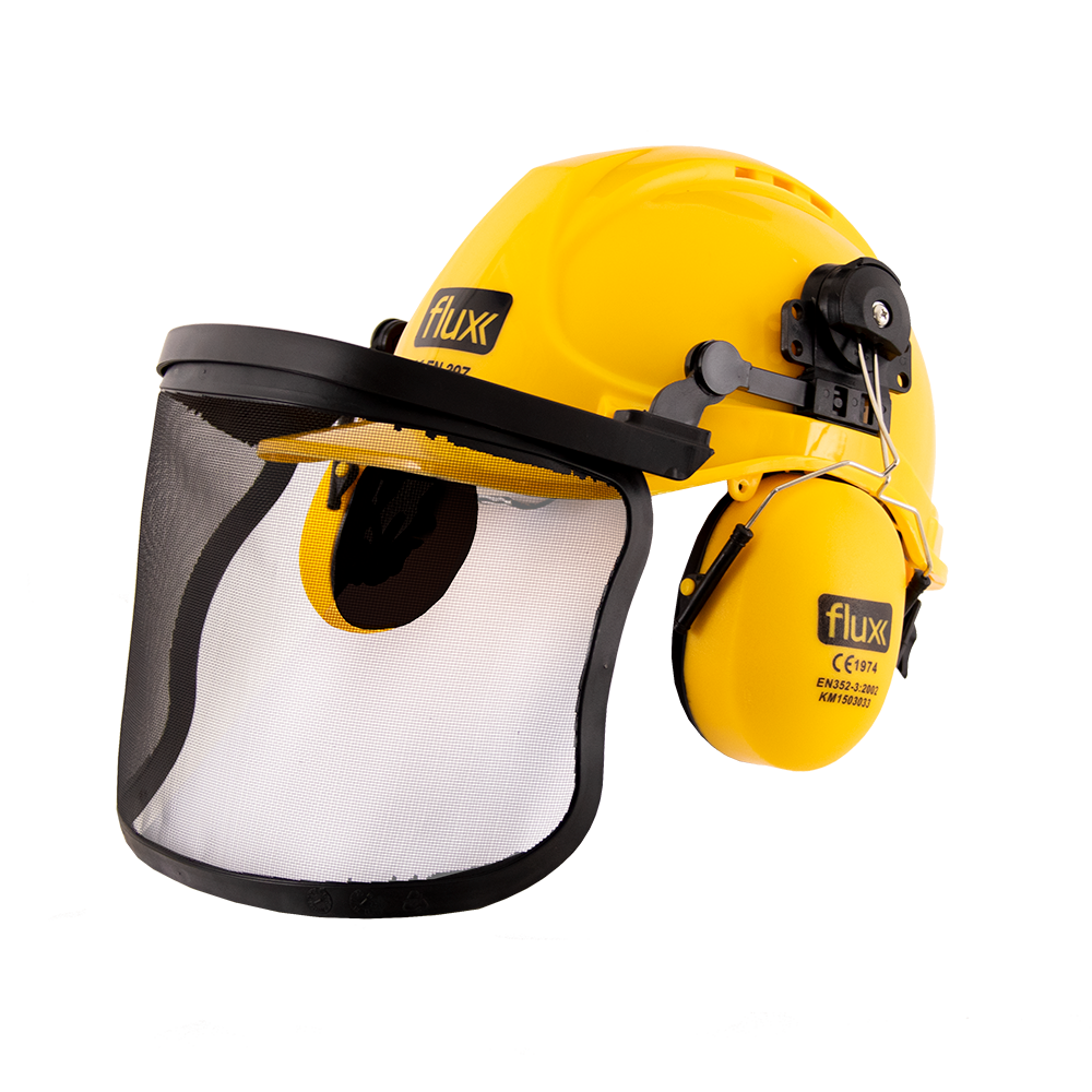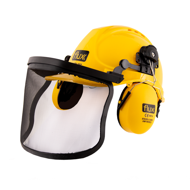Equipado com viseira em rede, para fornecer uma proteção contra os choques faciais, contra partículas de alta velocidade, impacto de baixa energia (45 m/s) e protetores de ruído, fornecendo proteção auditiva, ajustáveis, anéis revestidos, conchas em ABS e extremamente leves.