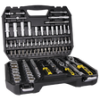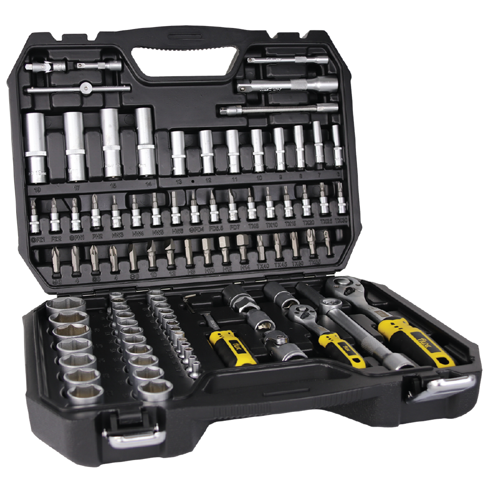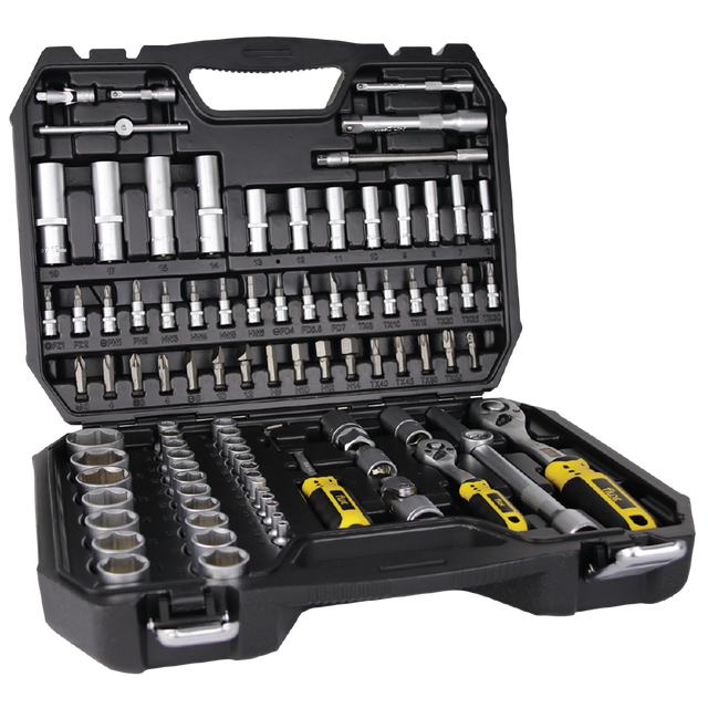 Conjunto composto por estojo de plástico e 94 peças fabricadas em cromo vanádio de alta qualidade.