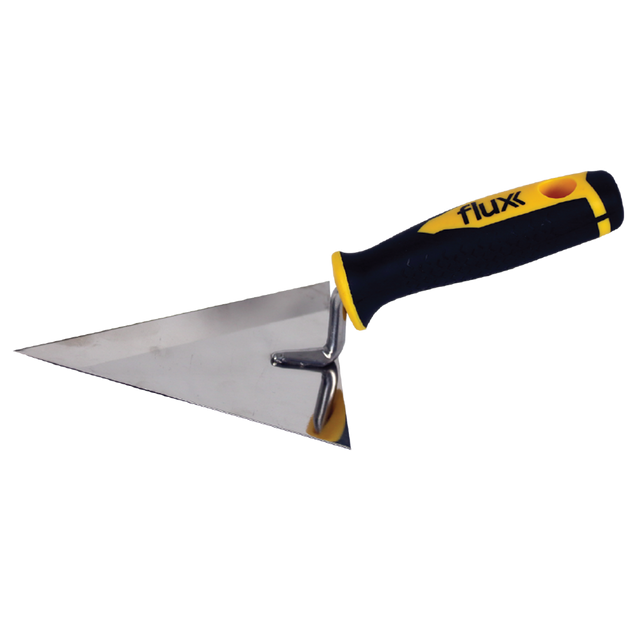 Colherim de pedreiro Flux forjado numa única peça de aço inoxidável, de forma a garantir que não se parta, nem oscile com o peso da massa.