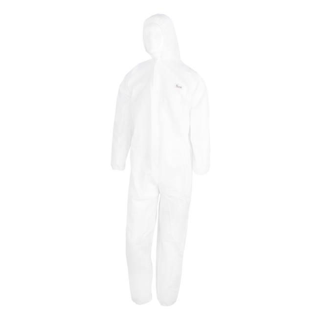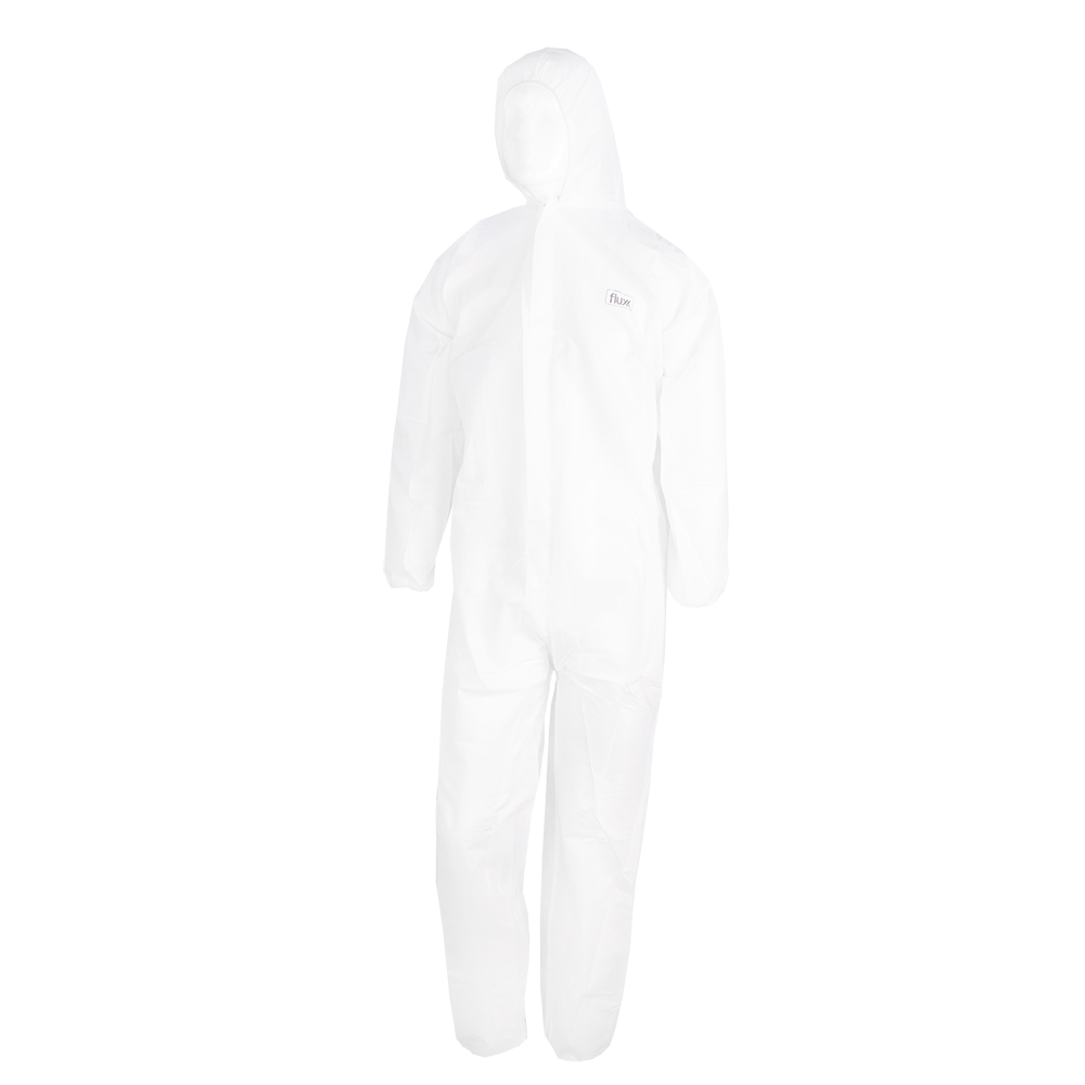 Fato de proteção para pintura Flux é fabricado com tecido não tecido de polipropileno com tecido revestido por filme quente de poliuretano.