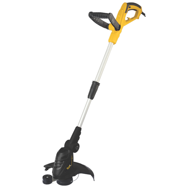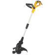 Aparador de cantos potente, com pega ergonómica e pega auxiliar ajustável, punho telescópio regulável, cabeça rotativa, bobine de fio com duplo corte, protecção com lâmina de corte de fio e apoio mural.