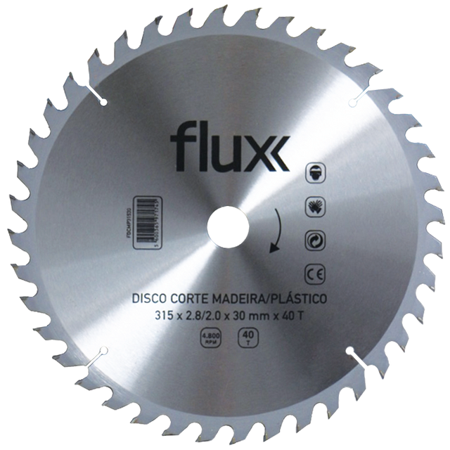 Disco corte de madeira e plástico Flux para utilização em serras e serras de esquadria e bancada.
