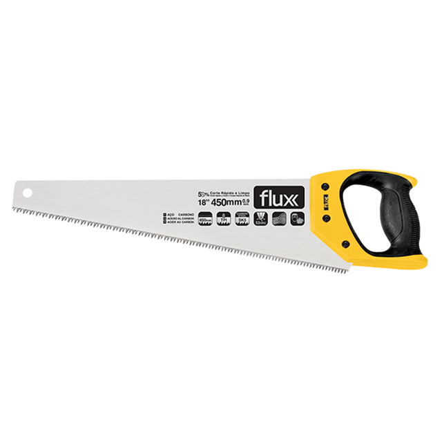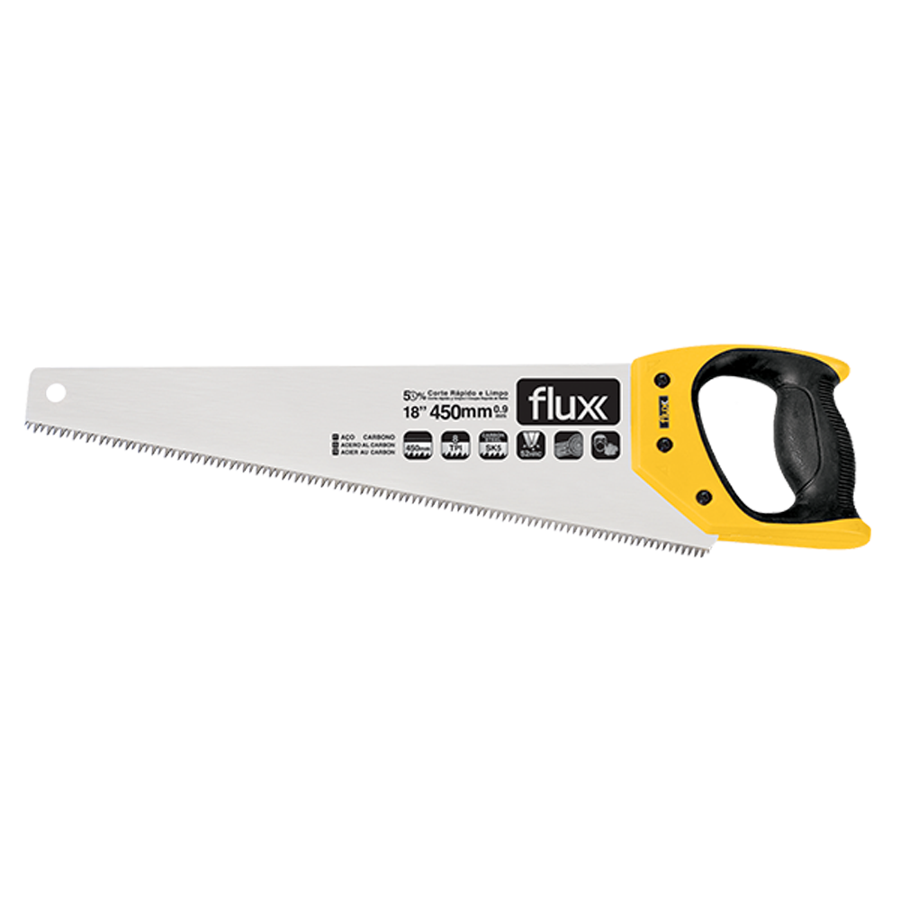 Serrote de carpinteiro de folha larga 550mm Flux permite um corte rápido, limpo e preciso de madeira, aglomerado, gesso, plástico, entre outros materiais.