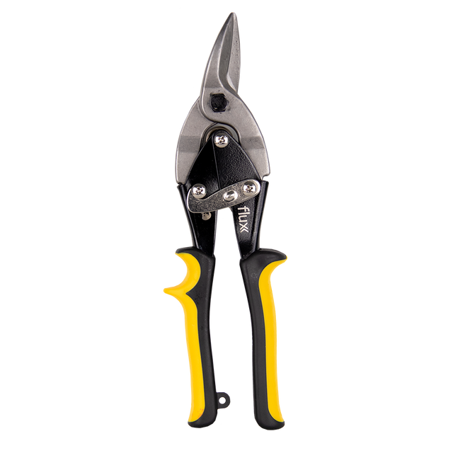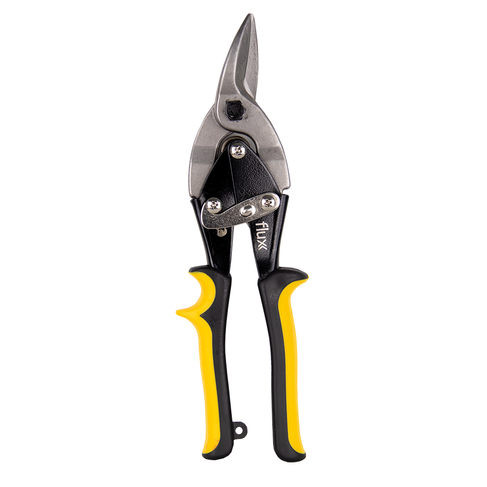 Tesoura de cortar esquerda reta 250mm Flux com grande alavancagem, que permite um corte com pouco esforço, com arestas de corte dentadas, de forma a evitar escorregamento no corte.