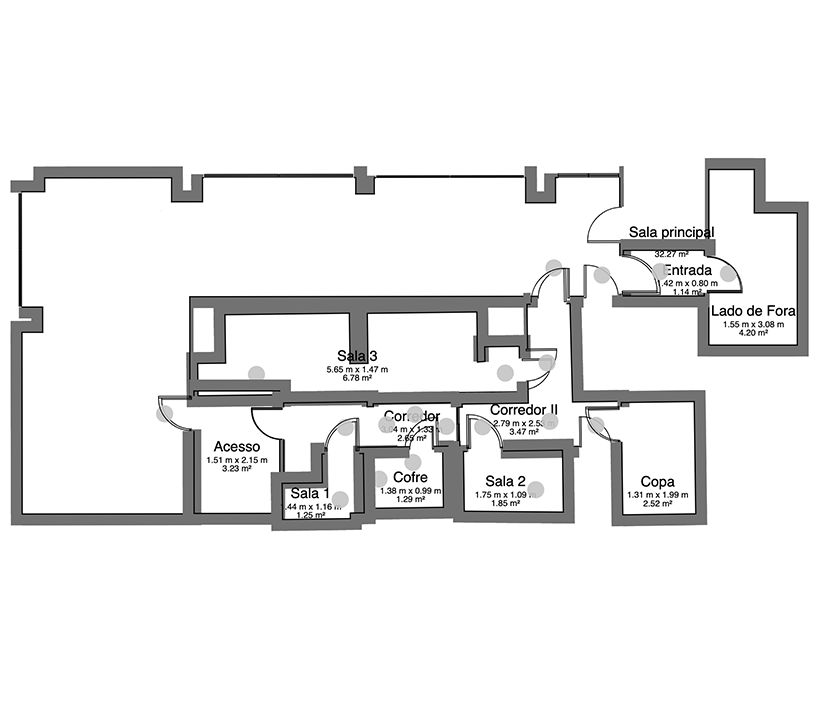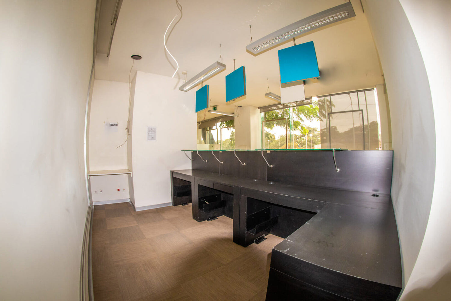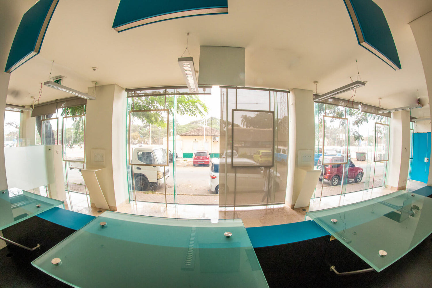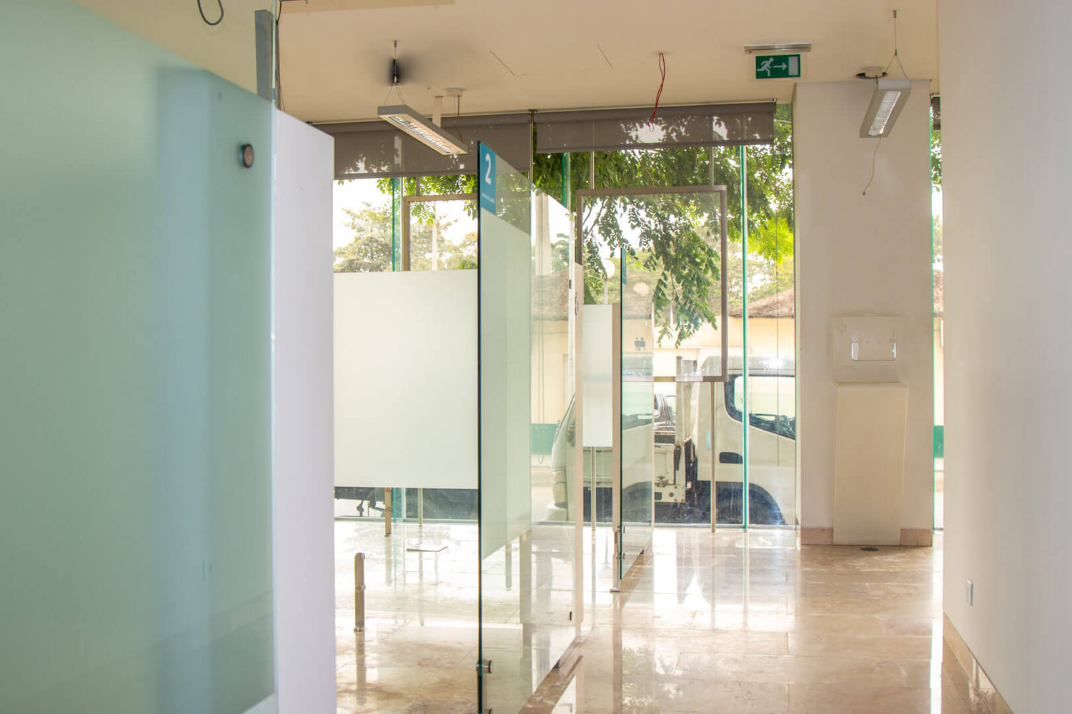A loja que apresentamos situa-se no rés-do-chão do Edifício Kwanza-Sul e conta com 165 m². É constituída por área de atendimento ao público com três postos de trabalho, área de ATM, sala de reunião, copa, WC, polo técnico, cofre, arrumos e tesouraria.