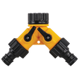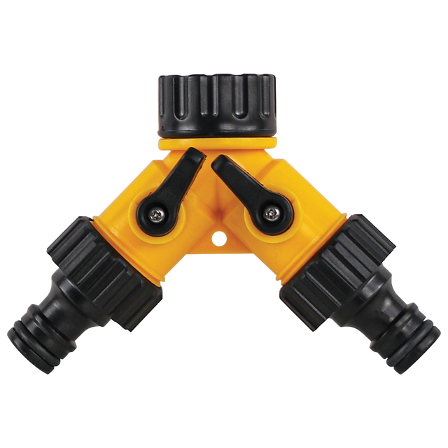 Ligação para tomada com duas saídas e regulador de caudal independentes o que permite ligar duas mangueiras em simultâneo, mas independente uma da outra.